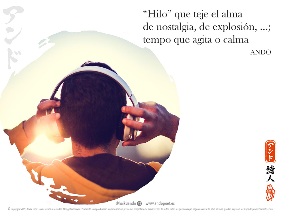 Recuerdo mi intensa pasión por la música desde que era adolescente, en sus géneros más variados… incluso llegué a grabarme (como quizás varios de vosotros) una “banda sonora de mi vida”, con temas musicales que me habían marcado… cada canción evocaba un momento crucial o un recuerdo personal. El alma es una tela rica en tejidos y colores. Así que, tantas almas como personas... Personas tejidas de hilos tan diversos como tipos de hilos musicales podemos encontrar. Con esta metáfora inicio este poema corto, en el que la música se erige como uno de los pilares (o más bien muros) emocionales de nuestras vidas, en los que quedan marcadas nuestras vivencias y sentimientos (vidas que, por cierto, transcurren velozmente para los que deciden marcarse un tempo pasado de revoluciones o se suceden pausadamente para los que eligen un tempo digno del vals más solemne . Al son de una infinidad de estilos musicales, nuestra mente e incluso nuestro corazón pueden llegar a vibrar respondiendo a la sintonía que cada instante nos marca.