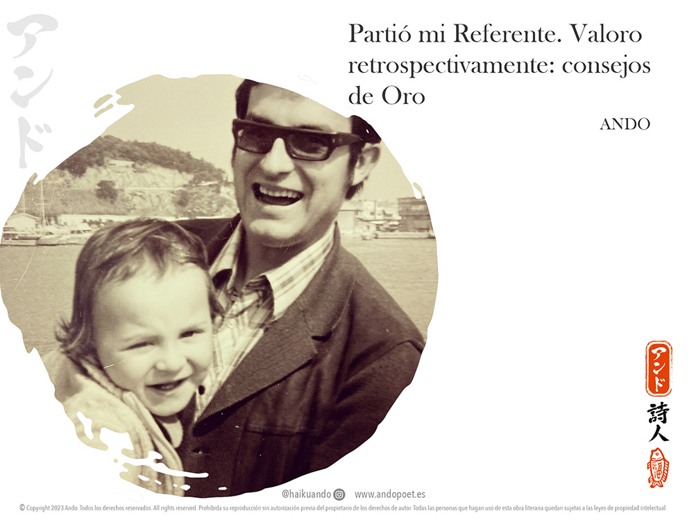Mi padre , de espíritu viajero, recorrió medio mundo -ya fuera solo o en pareja-. Esa apertura que le daban sus viajes, le proporcionaba un sentido práctico de la vida y henchido de su humor ingenioso. Su experiencia laboral y su amplia cultura general, amalgamaban a quien era mi consejero perfecto (adjetivo extensible, claro está, a su compañera de viaje y Madre mía). Nunca podremos agradecer lo suficiente a nuestros progenitores todo lo que hacen por nosotros. Así que… ten con ellos ese detalle, ahora que puedes. Es en su ausencia, cuando más “cotizamos” su existencia. Todos nuestros tesoros, tangibles o no, se revaloran solo con mirar atrás y actualmente constituyen esa columna vertebral que me mantiene en pie (y lo soporta todo).