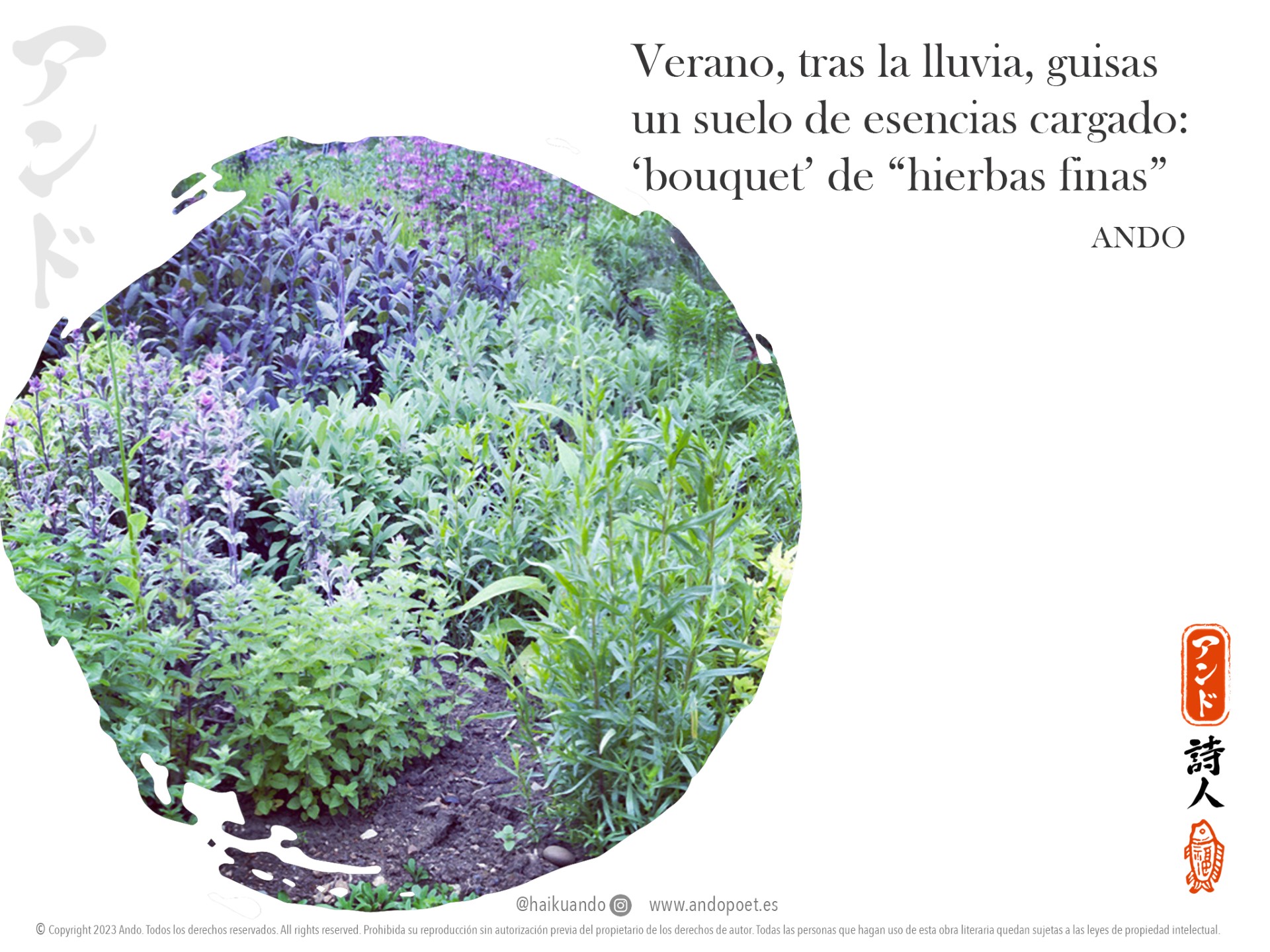 Recordando la imagen del ‘bouquet garni’ al ver como guisaba mi madre, surgió la inspiración para componer este poema, con referencias naturales y esencia de ‘haiku’. A partir de un parterre aromático que hallé paseando hasta donde ahora vivo (recorrido que empieza en los rincones románticos del ‘Parc de Can Solei i Ca l'Arnús’ y atraviesa un estrecho jardín metropolitano –‘Parc del Torrent de la Font’–), observé cómo el agua de una tormenta de verano, seguida de un sol intenso, actuaba sobre este vergel de hierbas culinarias, desprendiendo un delicado aroma...